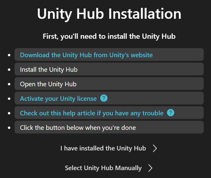 完成後按”我已經安裝Unity Hub如下圖