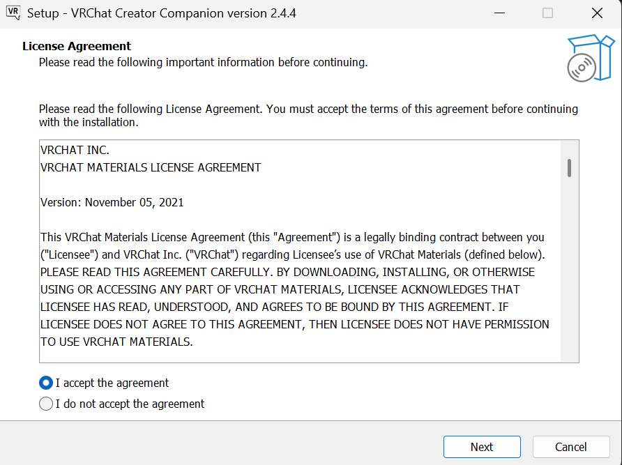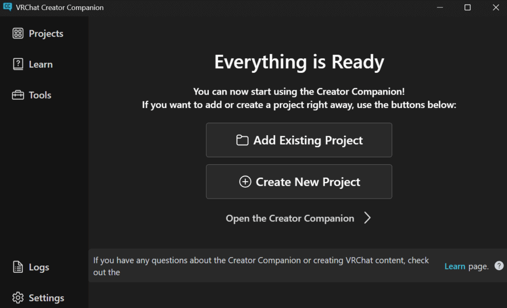 - 下載並安裝 VRChat Creator Companion (VCC),這篇教學撰寫時的版本是2.4.4,安裝VCC的好處是它會自動幫你檢查環境配置,確保你的各種安裝版本,請注意截至目前VCC對Unity版本有硬性的要求,版本號差一點點都不行。