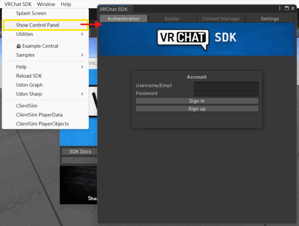 從工具列找到VRChat SDK彈出SDK畫面如下右邊視窗,可以登入帳號密碼