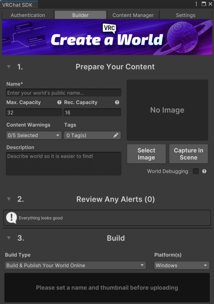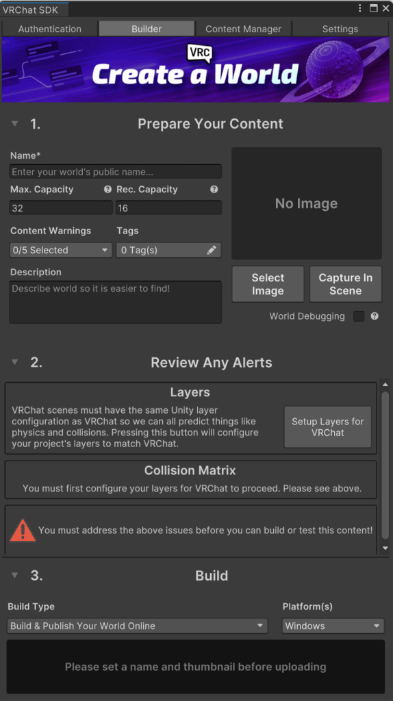 如果想嘗試製作VRChat上的世界,首先要有一個帳號,註冊和基本操作可以請參閱 Getting Started with VRChat – VRChat,或者上網搜尋熱心網友們製作的入門教學,等你完成註冊就可以進行下一步囉~
